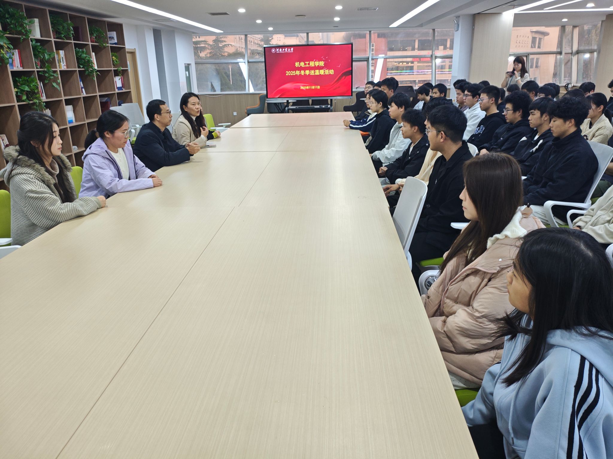 11月11日,机电工程学院院在德园“一站式学生社区”开展2025年冬季送温暖活动。院党委书记魏涛、党委副书记张东霞、全体辅导员及受资助学生代表参加活动,活动由张东霞主持。