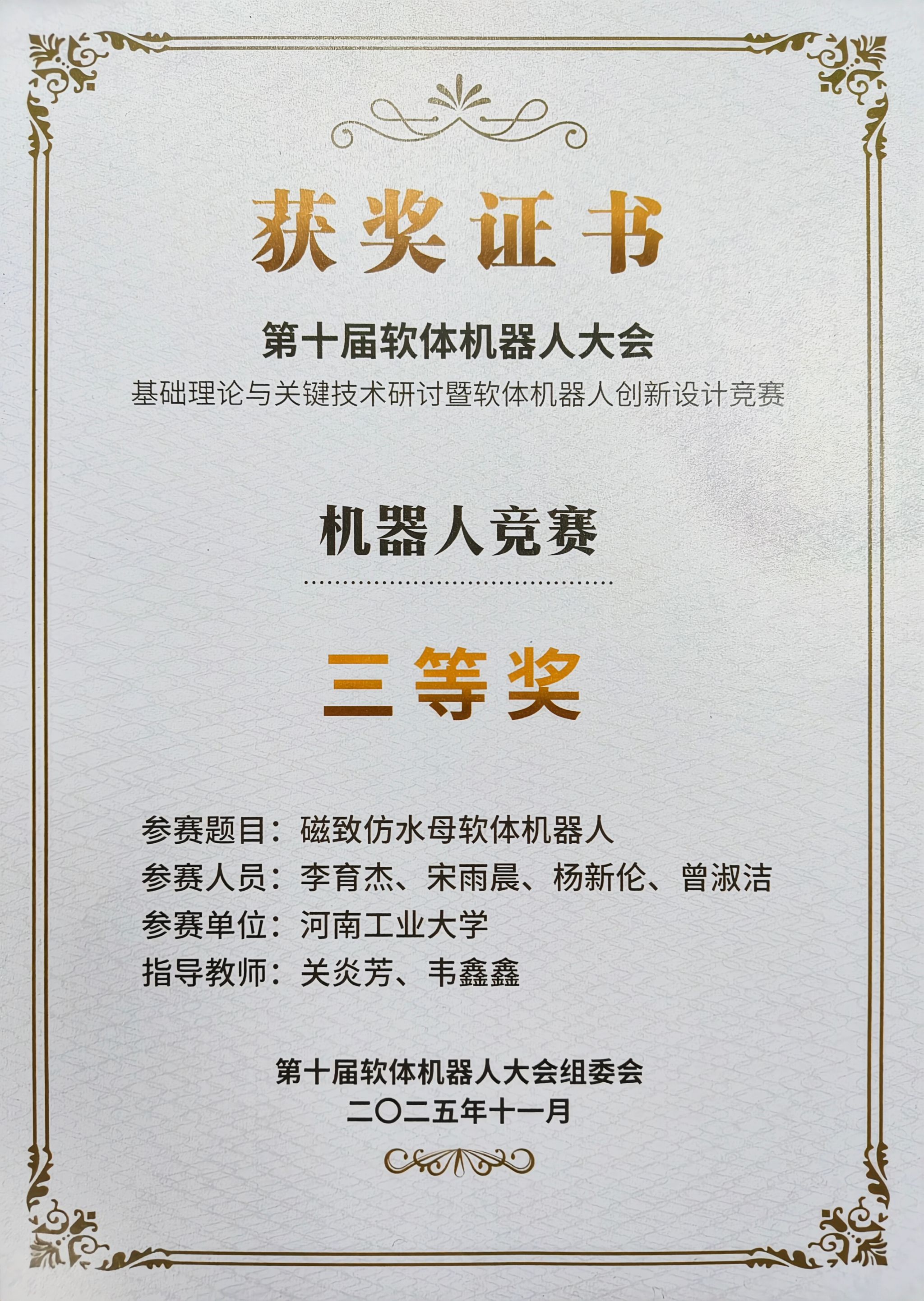 11月16日,第十届全国软体机器人大赛在青岛圆满落下帷幕。来自全国多所顶尖高校的代表队齐聚一堂,同场竞技。我院“智能传感与集成化检测”团队在关炎芳老师的带领下,凭借扎实的专业能力与出色的创新设计,在与清华大学、浙江大学、哈尔滨工程大学、中国海洋大学等强校的激烈角逐中脱颖而出,最终斩获两项大奖。