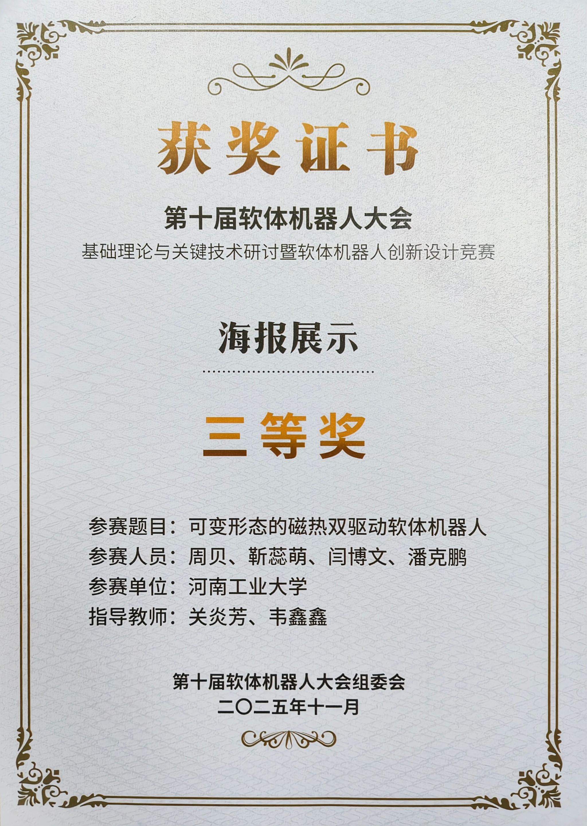 本届大赛赛道设置多样,竞争异常激烈。在海报评比环节中,“智能传感与集成化检测”团队参赛项目“可变形态磁热软体机器人”以其新颖的设计理念、清晰的逻辑架构和直观的成果展示,赢得了评委的高度认可,荣获三等奖。该项目聚焦磁热驱动技术与软体机器人的前沿融合,充分展现了团队在软体机器人驱动方式上的创新探索。在水下软体机器人赛道中,团队带来的“磁致仿水母软体机器人”同样表现优异。该机器人精准模拟了水母高效、灵活的游动特性,在操控稳定性与运动性能方面展现出明显优势。经过多轮水下环境测试,项目最终荣获该赛道第三名的好成绩。