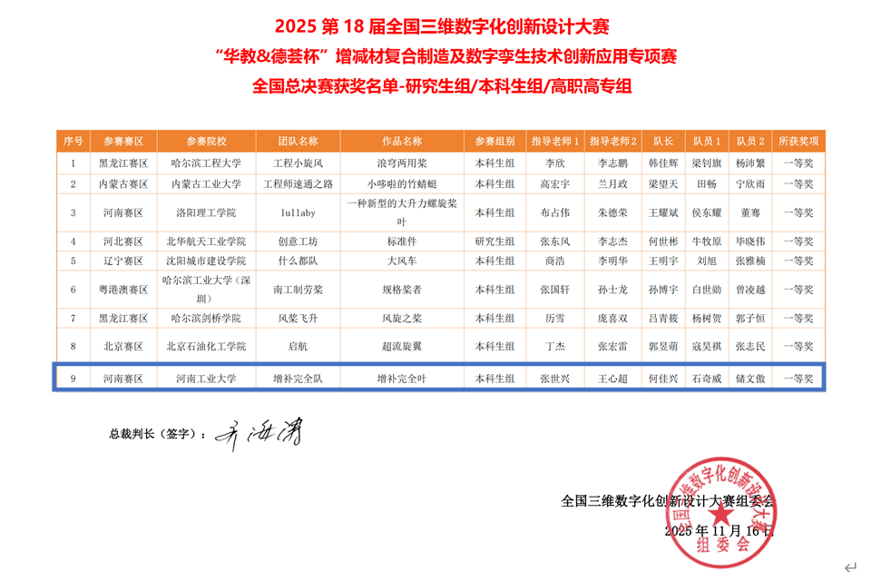 11月15日,由国家科技部、工信部、教育部、中国科协等部门指导,国家制造业信息化培训中心、全国三维数字化技术推广与教育培训联盟等部门联合主办的18届全国三维数字化创新设计大赛全国总决赛成功举办。来自全国各省市164支决赛队伍同台竞技,经过校赛、省赛、国赛等多轮角逐,机电工程学院张世兴老师指导,本科生何佳兴、石奇威、储文傲组成的参赛团队,斩获国赛一等奖。