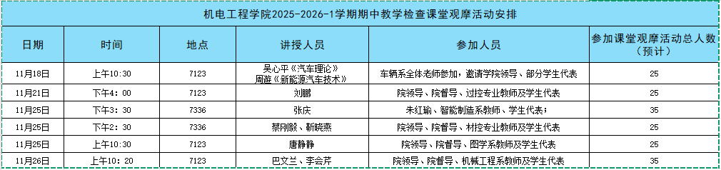 机电工程学院2025-2026-1学期期中教学检查课堂观摩活动安排